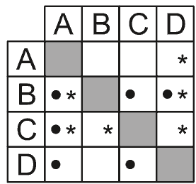 Questão 08 sobre Probabilidade Matemática: Modelo Enem. A tabela a seguir indica a posição relativa de quatro times de futebol na classificação geral de um torneio, em dois anos consecutivos. O símbolo • significa que o time indicado na linha ficou, no ano de 2004, à frente do indicado na coluna. O símbolo * significa que o time indicado na linha ficou, no ano de 2005, à frente do indicado na coluna.